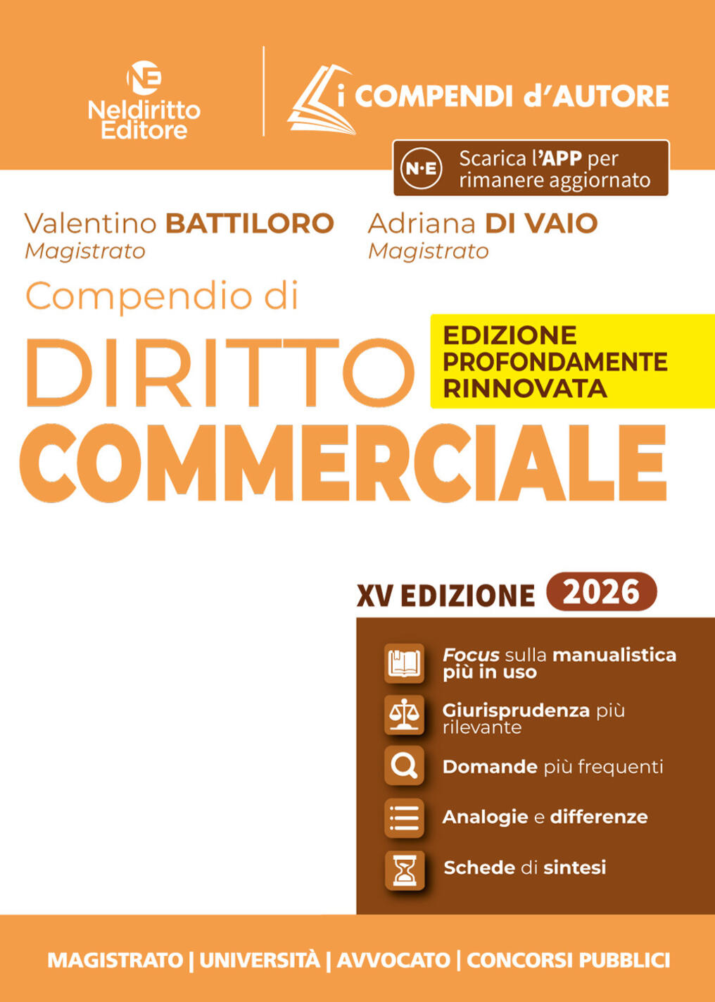 La collana I Compendi d’Autore da circa 20 anni è punto di assoluto riferimento per chi prepara gli esami universitari o le prove di abilitazione forense e dei principali concorsi pubblici. A caratterizzare la Collana sono la chiarezza nella forma, la sinteticità abbinata a completezza nella sostanza. Nell’Edizione 2026 veste grafica, struttura e contenuti sono stati profondamente rivisti per rispondere ancor più efficacemente alle esigenze di chi si prepara. Sul piano grafico, box, grassetti, elenchi puntati, rendono lo studio e la memorizzazione assai più agevoli. Numerosi i nuovi contenuti. L’intera trattazione è attentamente ricalibrata tenendo conto delle domande più frequenti negli esami universitari e nelle prove dei principali concorsi pubblici. È riportata e citata in appositi Focus dottrinali la Manualistica più utilizzata nelle Università, così da assicurare una preparazione completa. Si dà inoltre atto in Box giurisprudenziali degli orientamenti interpretativi più rilevanti; Per i principali istituti, sono messe a fuoco in ulteriori Tabelle, le Analogie e le Differenze per una conoscenza sistematica della materia. Per agevolare il ripasso sono, infine, inseriti in chiusura dei capitoli due ulteriori strumenti: le Schede di sintesi, utilissime per consolidare le conoscenze acquisite; le Domande più frequenti, per saggiare la preparazione. Il Compendio di Diritto Commerciale analizza la disciplina dell’impresa individuale, delle società, dei titoli di credito e delle procedure concorsuali, dedicando ampio spazio anche alle principali tipologie di contratti conclusi in ambito imprenditoriale. Il Volume tiene conto dei più rilevanti interventi normativi, tra i quali si segnalano il D.lgs. 19 giugno2025, n. 88 in materia di trasformazioni, fusioni e scissioni transfrontaliere oltre che del più significativo dibattito giurisprudenziale.
