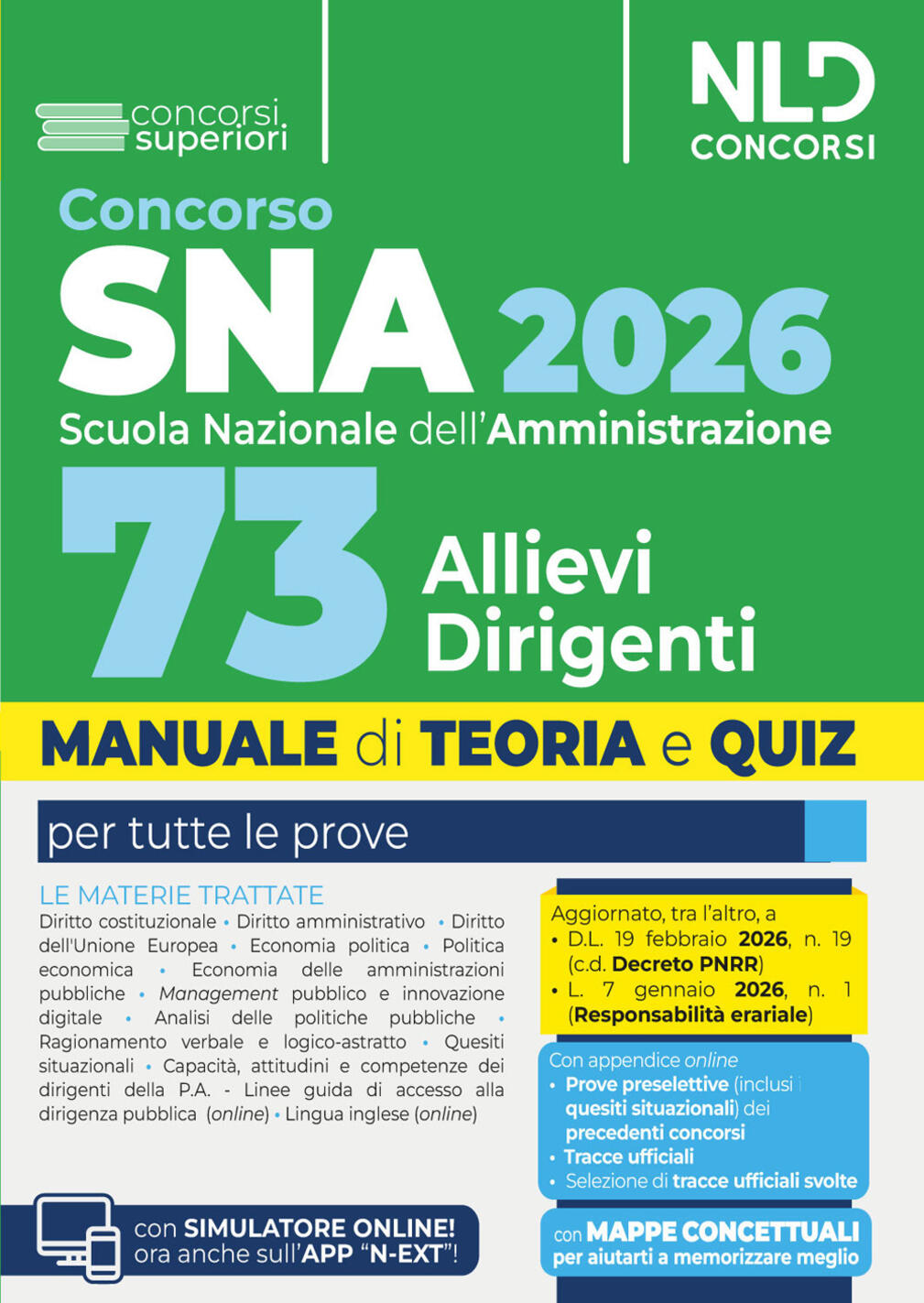 La Scuola Nazionale dell’Amministrazione ha indetto un concorso pubblico, per esami, per l’ammissione di n. 73 allievi al corso – concorso selettivo di formazione dirigenziale per il reclutamento di n. 61 dirigenti nelle amministrazioni statali, anche a ordinamento autonomo, e negli enti pubblici non economici. La procedura concorsuale è articolata in una eventuale prova di preselezione, tre prove scritte ed una orale. Il Volume Concorso SNA. 73 Allievi dirigenti. Quiz commentati, NLD Concorsi, 2026 viene incontro alle specifiche esigenze di chi deve prepararsi ad affrontare tutte le prove concorsuali. Il Volume contiene, infatti, quiz con soluzioni commentati sulle seguenti materie: Diritto costituzionale; Diritto amministrativo; Diritto dell’Unione Europea; Economia politica; Politica economica; Economia delle amministrazioni pubbliche; Management pubblico e innovazione digitale; Analisi delle politiche pubbliche; Ragionamento verbale e logico-astratto; Quesiti situazionali; Lingua inglese. Il Volume tiene conto delle più recenti novità normative, tra cui il D.L. 19 febbraio 2026, n. 19 (c.d. Decreto PNRR) e la L. 07 gennaio 2026, n. 1 (Riforma della Corte dei Conti e della Responsabilità erariale). I quiz, con soluzioni guidate e commentate, sono per lo più suddivisi per ciascuno dei capitoli di cui si compone il corrispondente Manuale Concorso SNA. 73 Allievi dirigenti. Teoria e quiz, NLD Concorsi, 2026 in modo da consentire di affiancare, allo studio teorico, un mirato esercizio pratico. Il Volume permette, infine, l’accesso ad un’estensione online, consultabile con apposita password, per rimanere aggiornati sulle materie oggetto d’esame e per esercitarsi con il simulatore online. Per una completa trattazione delle materie concorsuali si consiglia il Manuale Manuale Concorso SNA. 73 Allievi dirigenti. Teoria e quiz, NLD Concorsi, 2026.